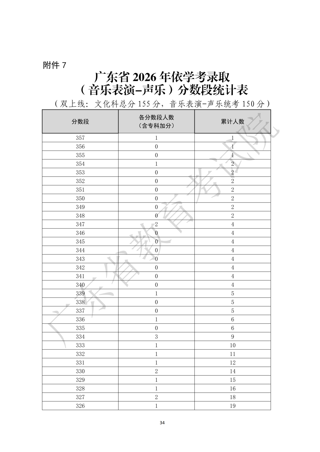 7.广东省2026年依学考录取(音乐表演-声乐)分数段统计表