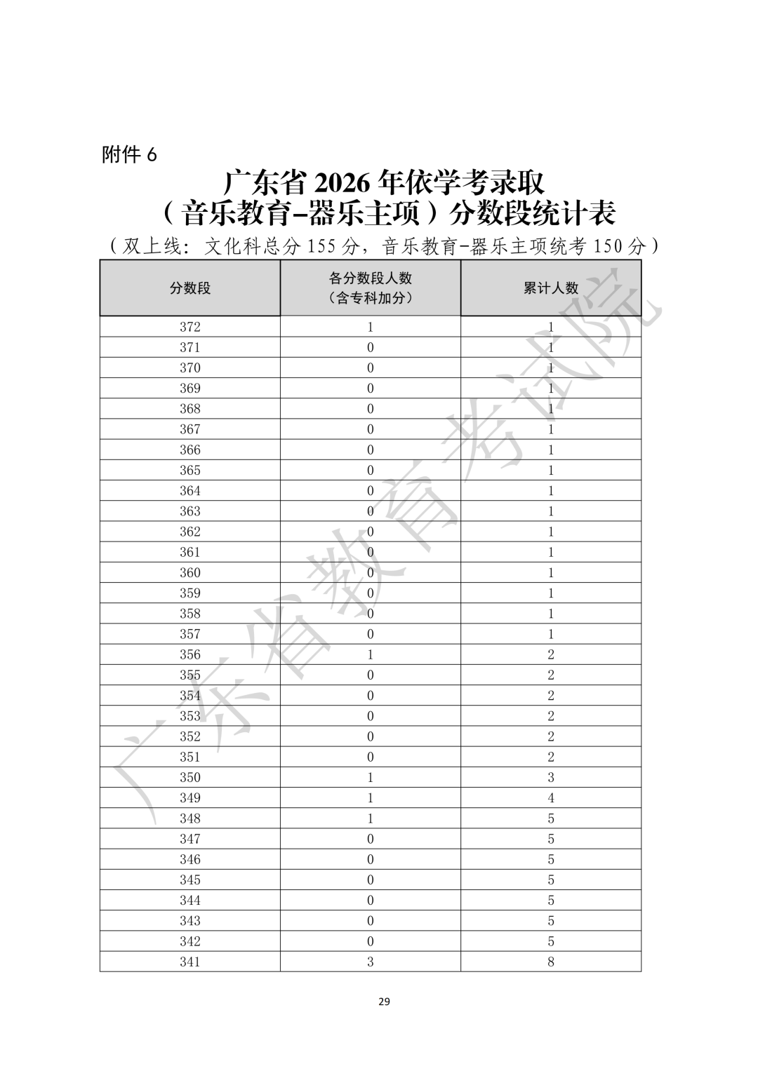 6.广东省2026年依学考录取(音乐教育-器乐主项)分数段统计表