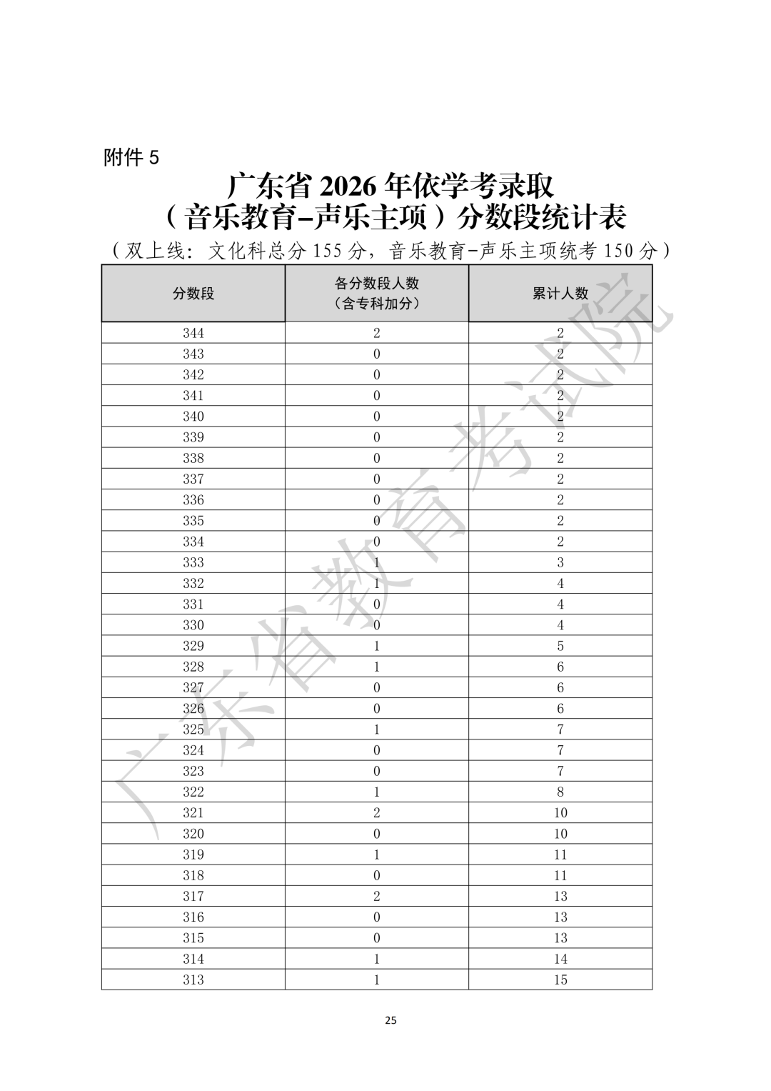 5.广东省2026年依学考录取(音乐教育-声乐主项)分数段统计表