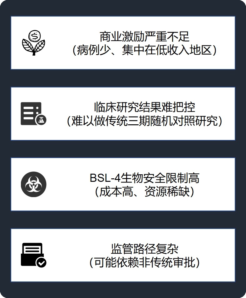 尼帕病毒是BSL-4级病原体(与埃博拉病毒、马尔堡病毒等同级别),所有涉及活病毒的操作都必须在最高级别的生物安全实验室进行,这极大地限制了可进行研究的机构数量,并增加了研发成本和时间。